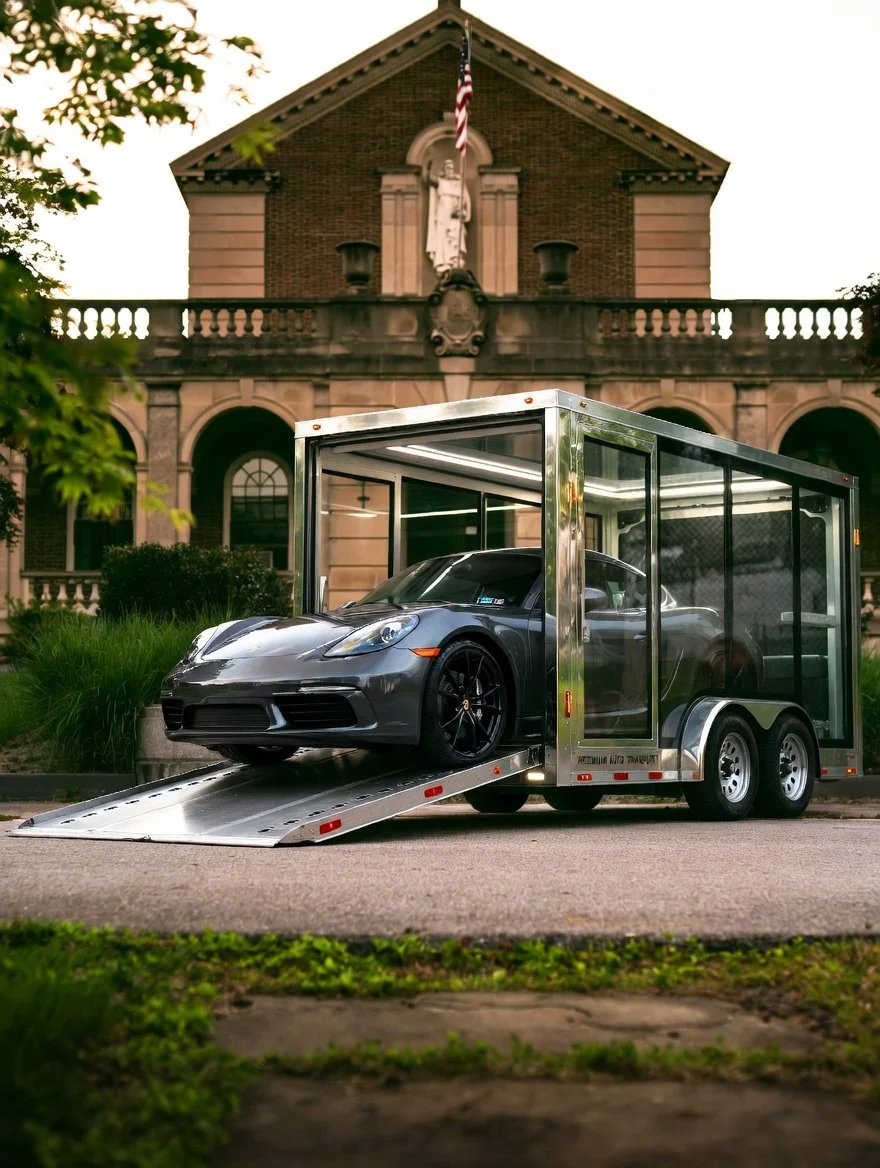 PREMIUMFor luxury, performance, or classic vehicles, our closed glass trailer service represents the pinnacle of automotive transport. Your car is fully enclosed within a refined, glass-walled trailer—shielded from weather, debris, and external exposure while remaining elegantly visible. The result is more than transport; it’s a presentation. Your vehicle arrives as if unveiled in a private showroom, creating a truly memorable delivery experience.